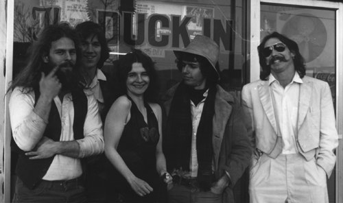 | The "Duck In" was for many years an institution on Main Street in downtown Charlottesville, Virginia. A family operation, the Duck In was the place to grab an 'Uncle Ray's sugar-cured ham' sandwich, and a natural choice setting for Sitting Ducks to take its first publicity photo, my first-ever. The photo was taken by our good friend, Laura Schoonover. Personnel (L-R) are: Peter Spaar (bass), Jimmy Hormel (saxophone), Judy Coughlin (vocals), Brian Alpert (drums), Kurt Kasson (guitar, vocals). Not shown: Dennis Guinan (guitar) |