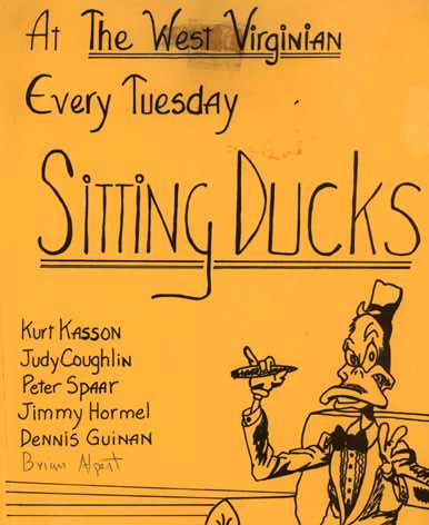 | In 1978 the drinking age was 18, videos and cable TV were wacky future-concepts and people were more likely to head out to a club to see a band on a Tuesday night. Our Tuesdays weren't packed with fans, but there was enough interest to keep things going. In the 90's, a steady Tuesday for a six-piece band is virtually unheard of. This hand-drawn poster was hanging in front of the West Virginian during the early weeks of our steady gig. A careful look reveals my name scrawled post facto in ball point pen, at the bottom of the list, the last Duck. I entered it there in the hours preceding my first professional gig. |